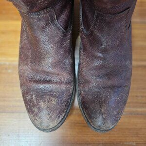 Pre-owned Frye brand "Carson" pull on, knee high, boots with low block heels. Brown leather. Heel is 1.25" tall. $378 new.