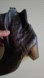 Women's leather ankle boots with chunky stacked heel. pull on style. The leather is a brown with burgundy undertones. Brand logo stamp at outer. Size 5.5.