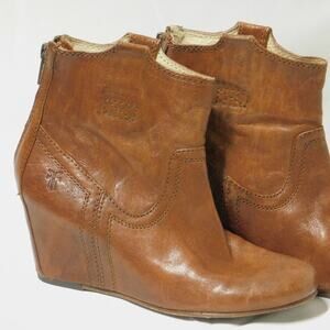 Frye Carson Wedge Bootie In Brown/Cognac color. They're Actually More Brown. With 3" Heel. 5" boot shaft 11" calf circumference.
