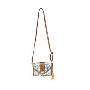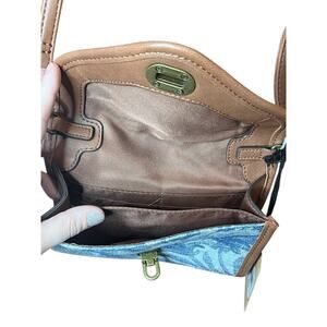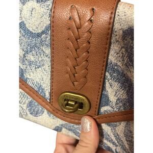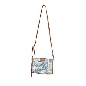 Stylish and versatile crossbody bag by Frye & Co. featuring a unique blue floral print fabric with tan trim. The purse has a braided detail and a vintage-style flip-lock closure. Perfect for daily use, it combines elegance and functionality. Comes with an adjustable shoulder strap for comfort.
