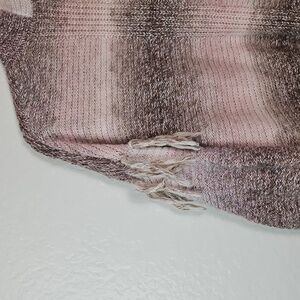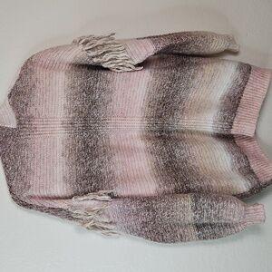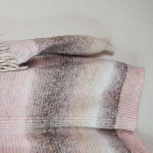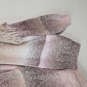 Cozy and stylish Frye & Co. open-front cardigan in a beautiful ombre mix of pink, taupe, cream, and brown tones. Designed with fringe accents on the sleeves for a boho-chic vibe and a relaxed oversized silhouette. Perfect for layering over tees, blouses, or dresses.