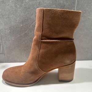 Frye & Co Phoebe Slouch Mid boots in cognac suede leather. Heel is approximately 2.75 inches.