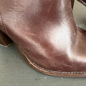Elegant dark brown leather booties with side zippers. Perfect for versatile styling.Minor scuffs.