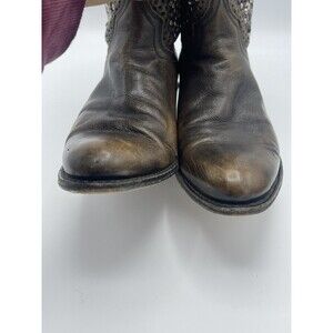 I mid calf, encrusted with tri color metal studs over distressed for green leather booties by fray. Truly the definition of a statement piece on your feet. These boots that are made in Spain feature leather lined, leather outsole, Debra studying hardware, Goodyear welt construction, 6 inch shaft height, 11 inch shaft circumference and 1 3/ 4 inch heel height. These boots are pre- loved but with the distress look they look fairly new to me. Right boot does have one nail missing on bottom ( please see last picture ) . These boots are a distressed brown leather not the crackled brown leather. Size 8. Comes from a smoke free home. Retail cost $598