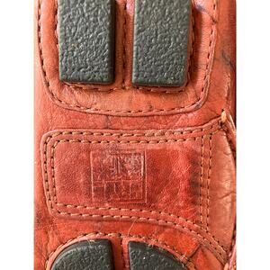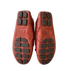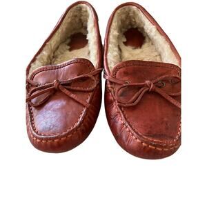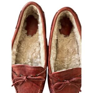 Fun and cozy driving moccasins by Frye. Rich rust colored uppers, scrumptious shearling lining. Rubber driving moc soles. Gently worn with a tiny bit of wear on toes but could be easily polished out. Size 7.5-8 women's.