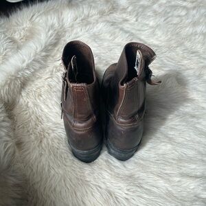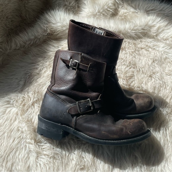 Classic Frye Engineer boots with sturdy, worn in brown leather. Features dual buckle strap detail. Sturdy boot with lots of life left + broken in! Size 8.5