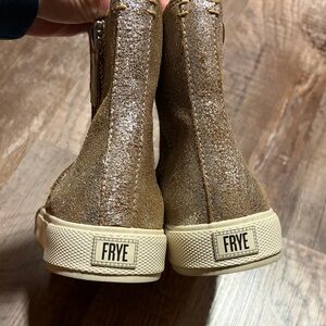 Frye high-top sneakers with a shimmering finish. Adds a touch of glam to your look. In excellent condition