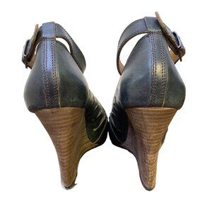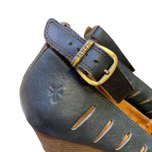 Frye Gwen Ankle Strap Black Leather Wedge Sandals 9.5