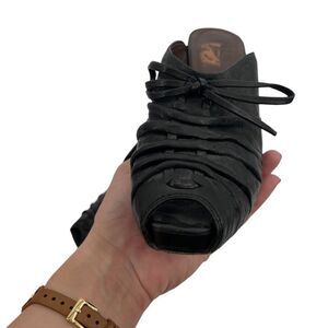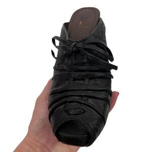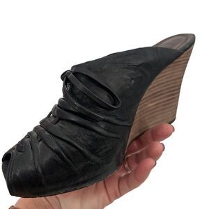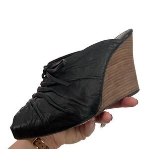 Frye Gwen black peep toe wedge mule with tie size 8.5 gently used condition see photos for details a bit of wear to soles but nothing noticeable when on the wearer
