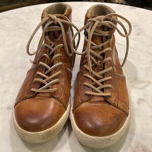 Hightop mens sneaker from Frye. Saddle color leather. Leather laces. Good preowned condition. Size 8 men.