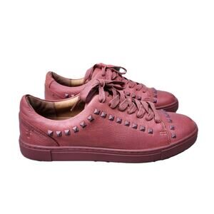 NWOT: Retro chic, "Ivy Deco" salmon pink premium leather upper sneakers with same colored pyramid stud accents / lace up construction / low top / waxed fabric laces / padded collar / molded leather footbed with arch support / thick rubber outsole / embossed logo by Frye. In excellent new intact condition.