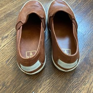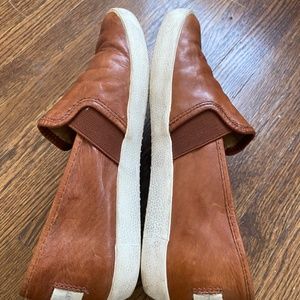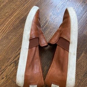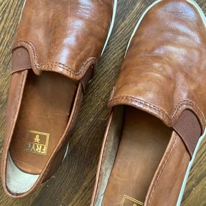 Comfortable leather slip-on shoes with a sturdy rubber sole. Beautiful cognac color. Frye shoes only get better with age.