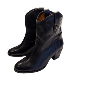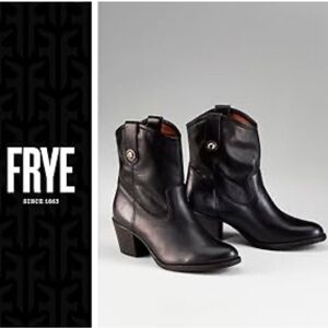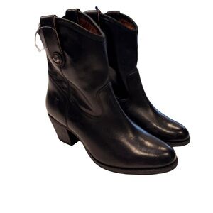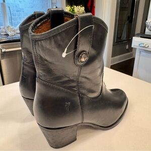 BRAND NEW. Women’s black leather Frye Jackie short Button FRYE boots. Western/ cowboy style, Pull on loop, metal button with logo & embossed logo. Size 7.