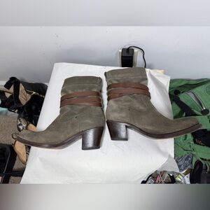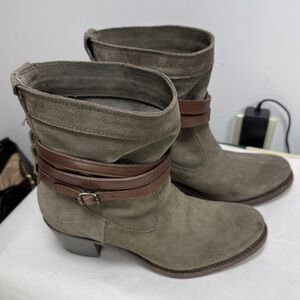 Frye Jane Slouch Suede Pull On Leather Straps Olive/Gray suede 7.5B Stacked Heel