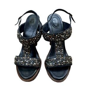 Frye "Joy" Black Slingback Studded Leather T-Strap Stacked Heel Pumps Size 10B