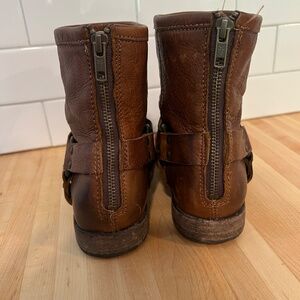 Beautiful pair of Frye ankle boots with harness strap detailing and rich brown color. Timeless and versatile style with quality Frye craftsmanship. These boots are a staple for any wardrobe.