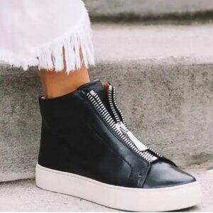Size 9.5. Frye Lena Zip Up Leather High Top Sneaker in black. Polished zip styling updates leather high-top sneakers. Minor scuffing on sole. All measurements are approximate.