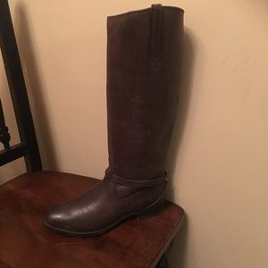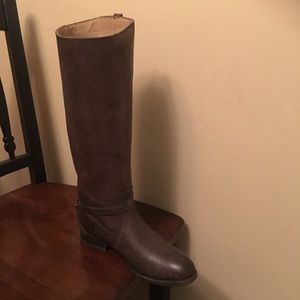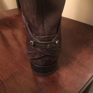 Knee-high riding boot featuring slender ankle strap and antiqued logo plaque at heel
