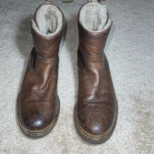- Italian leather- Shearling lined- Rubber outsole- Antique metal hardware- 6" shaft height- 12 2/5" shaft circumference- 3/4" heel height