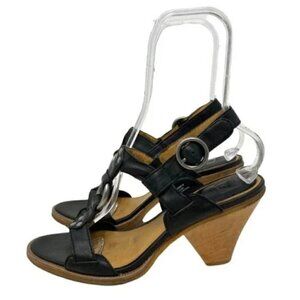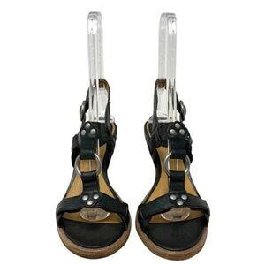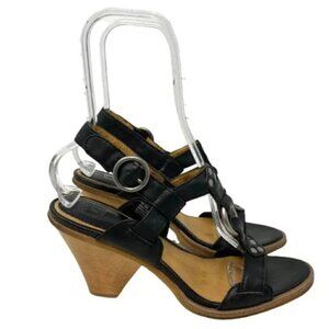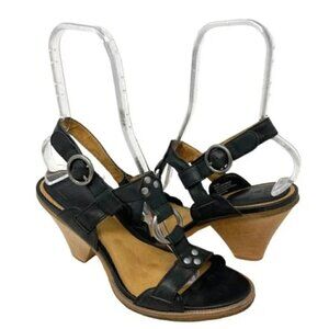 Frye Mandy Black Leather T-Strap Wood Heel Sandals - Size 10. Crepe Sole.
