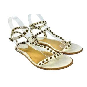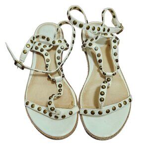 The Frye Mary Studded Strap Sandals in women's size 6.5 are a stylish and versatile choice for casual occasions during the spring and summer seasons. Featuring a solid white color with studded accents, these leather sandals have a strappy design with a flat heel for all-day comfort. The high-quality leather lining and insole provide durability and a luxurious feel, making these sandals both fashionable and practical for any wardrobe. Perfect for adding a touch of edgy sophistication to any outfit.