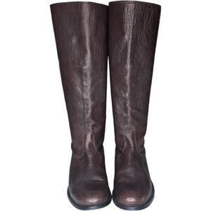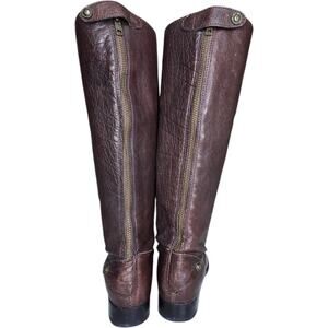 Dark brown high equestrian style boots with back zipper and snap closure.