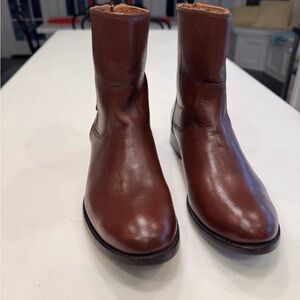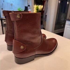 BRAND NEW without the box. women’s Frye leather boots. The color is a dark brownish burgundy, back zip up, snap accents, embossed logo. Size 8.5