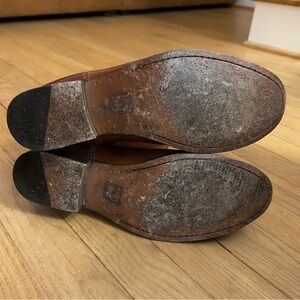 Brown leather upper with tan leather lining and matching fixed leather insole; pull on design with button at both sides; stacked low leather heel with leather/rubber heel cap - the balance of the sole is leather.