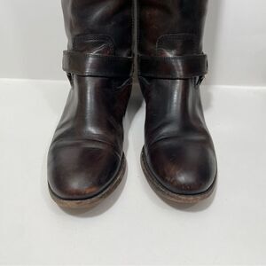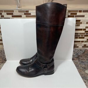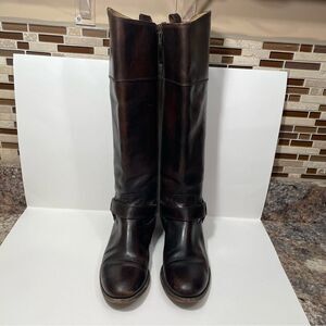 Gently worn women’s size 7.5 the Frye company brown leather tall riding boots. Full zipper closure, slight heel. Please review all photos for any signs of wear-pictured as is. Disclaimer: Any items with any wear/staining has not been treated, and unsure of ability to remove/treat condition. Comes from a smoke free home, bundle with other items to save & minimize shipping cost.