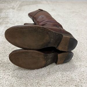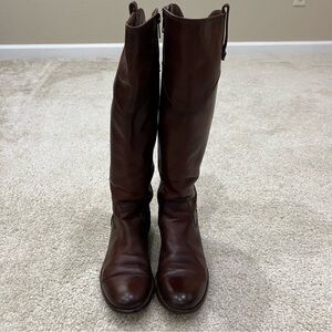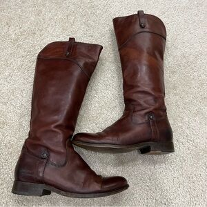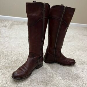 Frye Melissa Tab Red Brown Leather Tall Riding Boot Side Zip Women Size 6 B, Preowned condition, leather discoloration on both boots, light wear on heels, soles, scuffing throughout boots, creases on leather, pictures provided