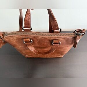 Can be carried with small handles or worn crossbody with the generous strap that’s adjustable up to 24”. Very comfy on and not bulky at all. Weighs 1 lb.. 4 oz. Leather is top grain with natural markings giving its unique look. Very roomy with hefty zipper pull and top zipper. Has one outside pocket that measures 7 1/2” x 6” that closes with a strong magnetic closure. Bag measures approximately 11 1/2” x 11” and approximately 3” deep.
