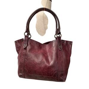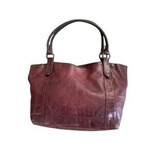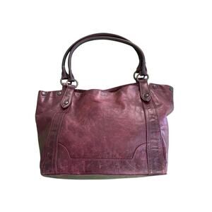 Frye Melissa Wine/ Burgundy Leather Shoulder Bag Top Handle Tote Satchel Shopper. Stylish leather tote Shopper, perfect for everyday use. This refined shoulder bag features dual top handles, silver-tone hardware accents, and subtle stitching details that showcase the brand's craftsmanship. The exterior is made from quality leather, offering a classic and durable design. Frye embossed logo.