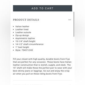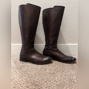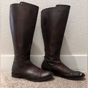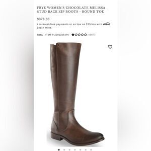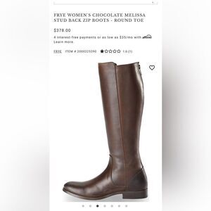 Great overall condition. Mild wear. Frye Melissa zip up riding boots in chocolate. Size 8.5. Recently conditioned. Round toe. Real leather. Smoke free home. Never worn to the barn, does not smell like horse. Still on the Boot Barn website for $378.