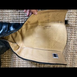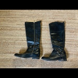 Black leather Melissa riding boots, featuring side zippers. Size 7.5. Frye.