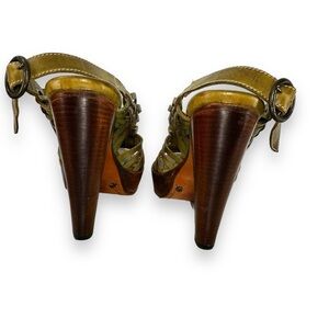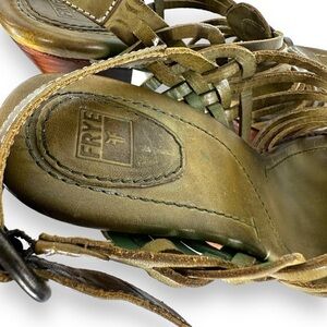 Stylish Frye heels with strappy design. Olive green leather. Wooden platform and heel. Perfect for a chic look. Beautiful- but too big for me!!! Have to Reposh!
