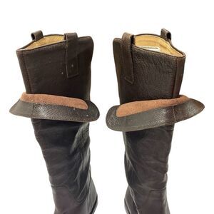 OVERLAPPING FRONT PANELS and intricate stitching, these standout riding boots boast a unique, artisanal look