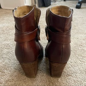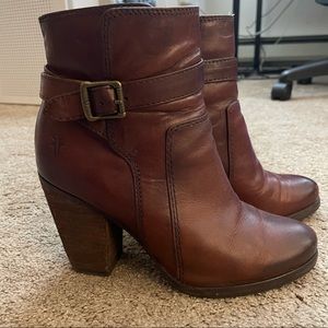 In short, this bootie is an urban take on a traditional riding boot. A tapered, stacked heel and tailored ankle gives it a polished stance. The antiqued buckle and leather strap add a finished touch, while Frye's signature hand-burnished finish makes the leather glow.
