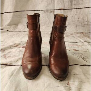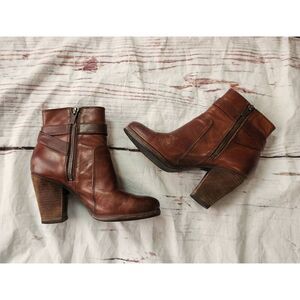 Distressed leather upper ankle booties with man made sole, side zip closure, and decorative buckle at ankle. In good condition. Refer to photos for light wear.