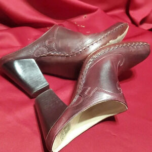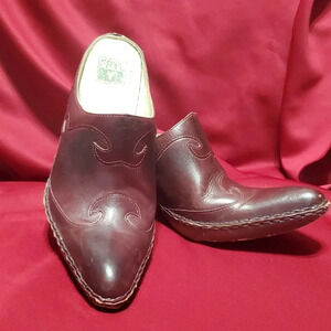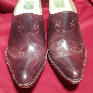 good used condition minor wear at toes cognac red brown Phoenix mule.with heel by Frye size 6.5