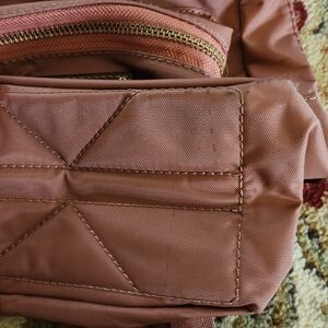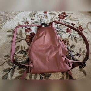 Used in condition, a few dark marks on the bottom of the bag. Last picture shows the area where the marks are located. Stylish pink mini backpack by Frye. Features multiple zippered pockets and a sleek design. Approximate measurements are 11 in H X 8 in W X 4 in W.