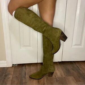 Frye suede moss khaki green tall knee high heeled boots