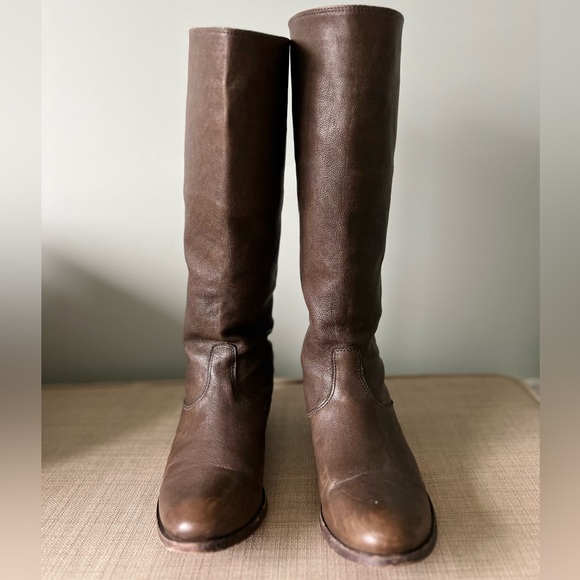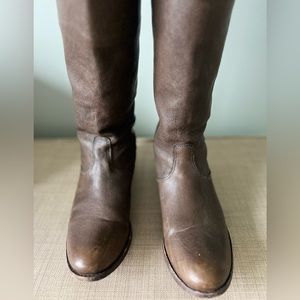 Gray/Brown Frye Riding Boots. Size 7.5. EUC. Have some scuffs on the toes that I’m sure could be buffed out. They zip up the back and have a snap at the top and bottom.