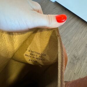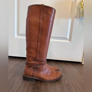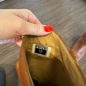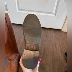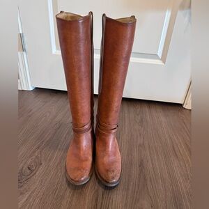Women’s Frye Riding Boots. Red/orange color with a distressed look. SUPER comfortable boots. I have them in brown and black as well and love them, but I don’t wear this color enough to keep. Size 7 true to size.