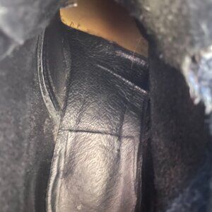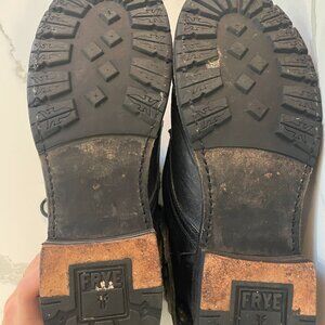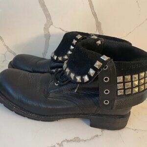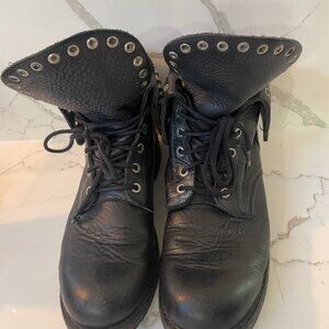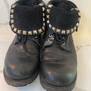 Heavy duty distressed black leather boots with studded details by Frye. Can be worn folded over to show studs or unfolded up high. Size is worn off, they fit women size 10. Upon close inspection, the only defects I find are a loosening at the end of one shoelace and rolling up of the fabric layer on the shoe soles, which is not noticeable when worn. (see photos).