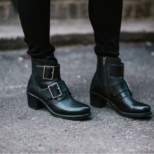 Frye Sabrina Double Buckle Vintage Academia Black Leather Block Heel Ankle Boot