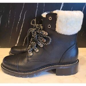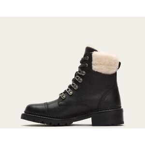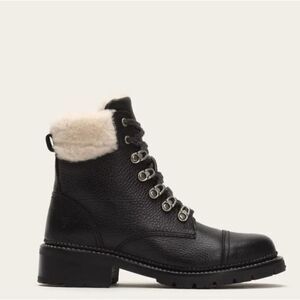 New without tags or box | Frye Samantha Black Pebbled Waxed, Shearling Collar Waterproof Lug Sole, Cap Toe Block Heel Lace-up Leather Hiking Boots | 8 B | MSRP $398