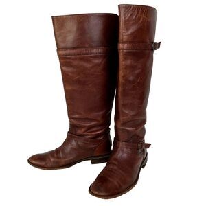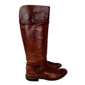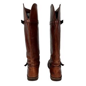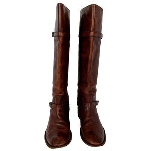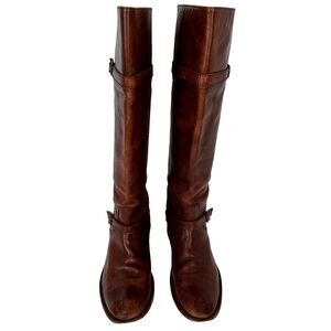 Frye Shirley Pull Riding Boots Full Leather Knee High Buckles Cognac Brown 6.5