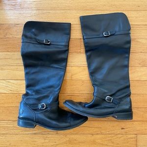 Sleek leather riding boot from Frye with strappy buckle detail. Stacked wood heel with rubber heel strike; leather sole.