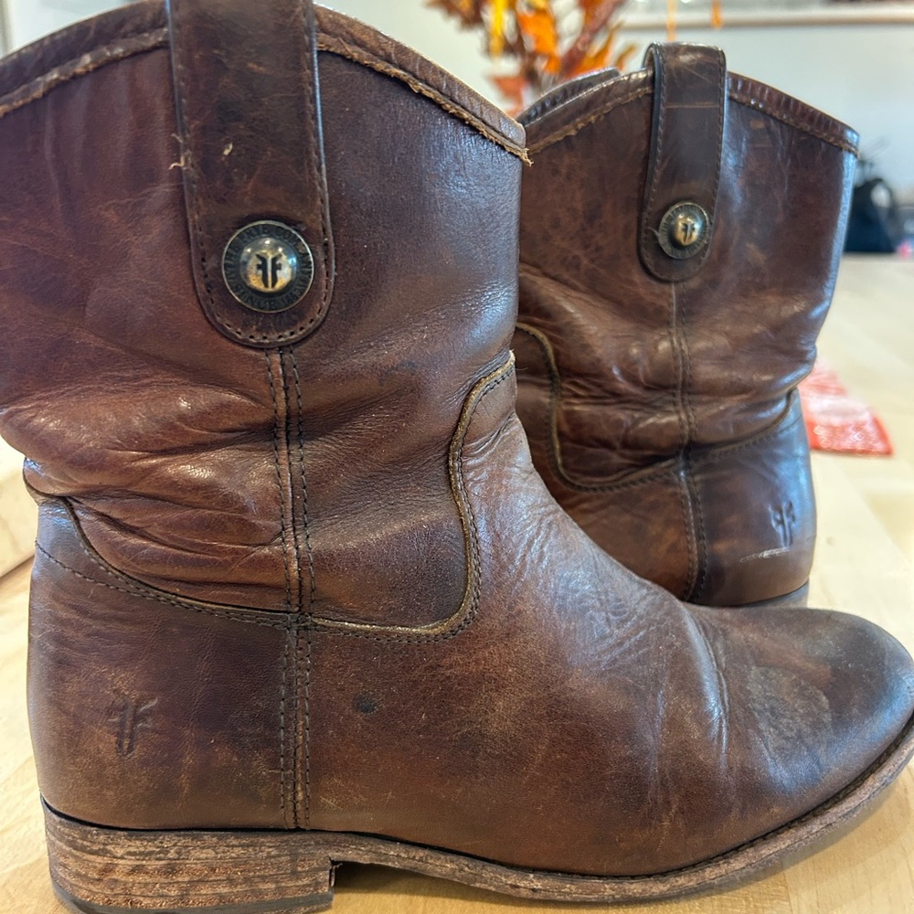Well loved but still beautiful leather and fashionable style. Side zipper for easy on and off. Frye button detail on stirrup and stamped leather logo near heel. Slight wearing hole on bottom of left boot, but not noticeable in wear and could be easily repaired. Frye is high quality vegan leather.