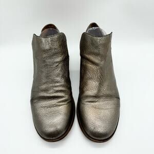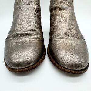 Step out in style with Frye's silver ankle booties, featuring a sleek metallic finish that adds a touch of sophistication to any outfit. These booties boast a minimalist design with a slip-on style and a low stacked heel, ensuring both comfort and elegance. Crafted from soft, flexible leather, they promise durability and everyday wearability. Perfect for adding a modern edge to your wardrobe.